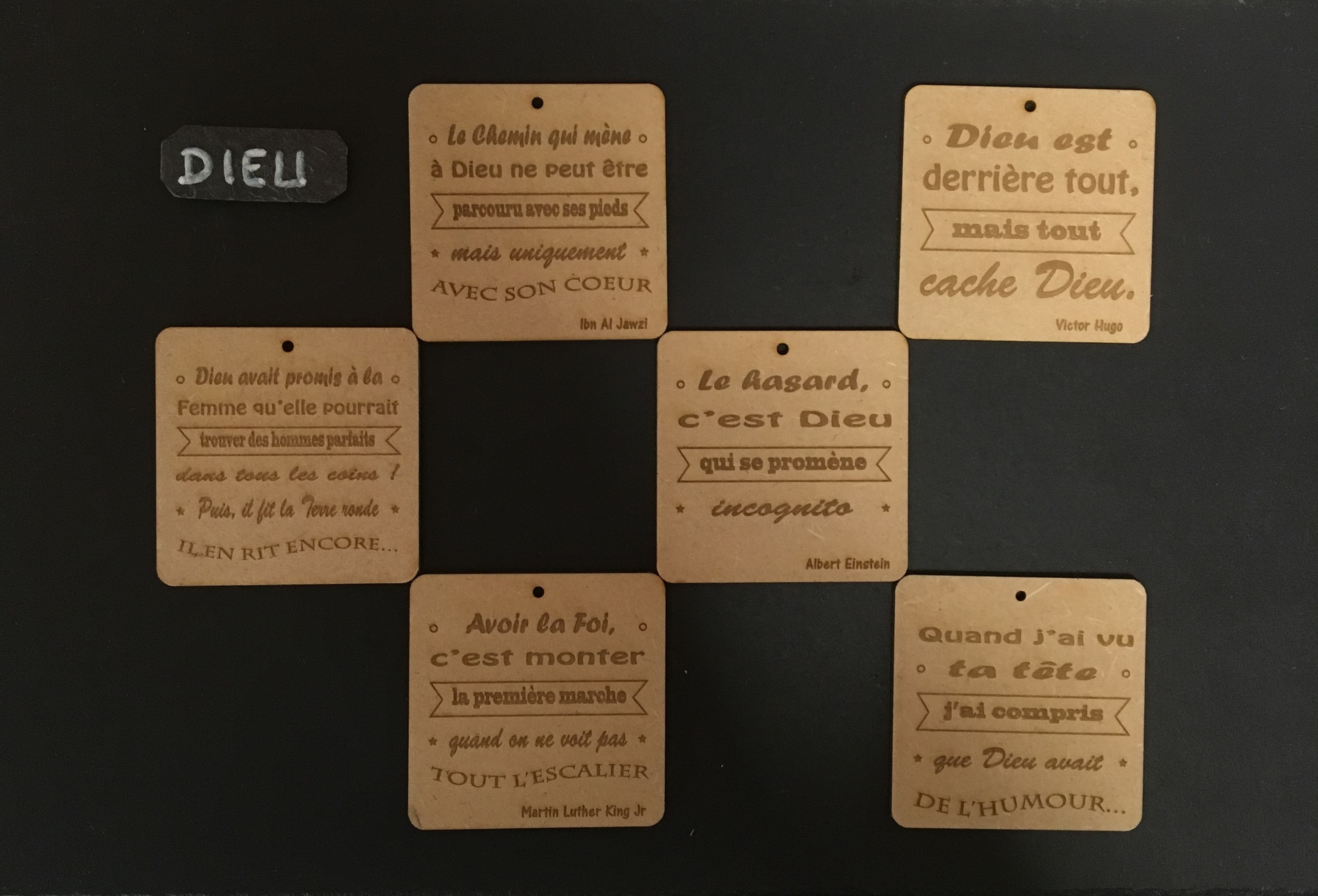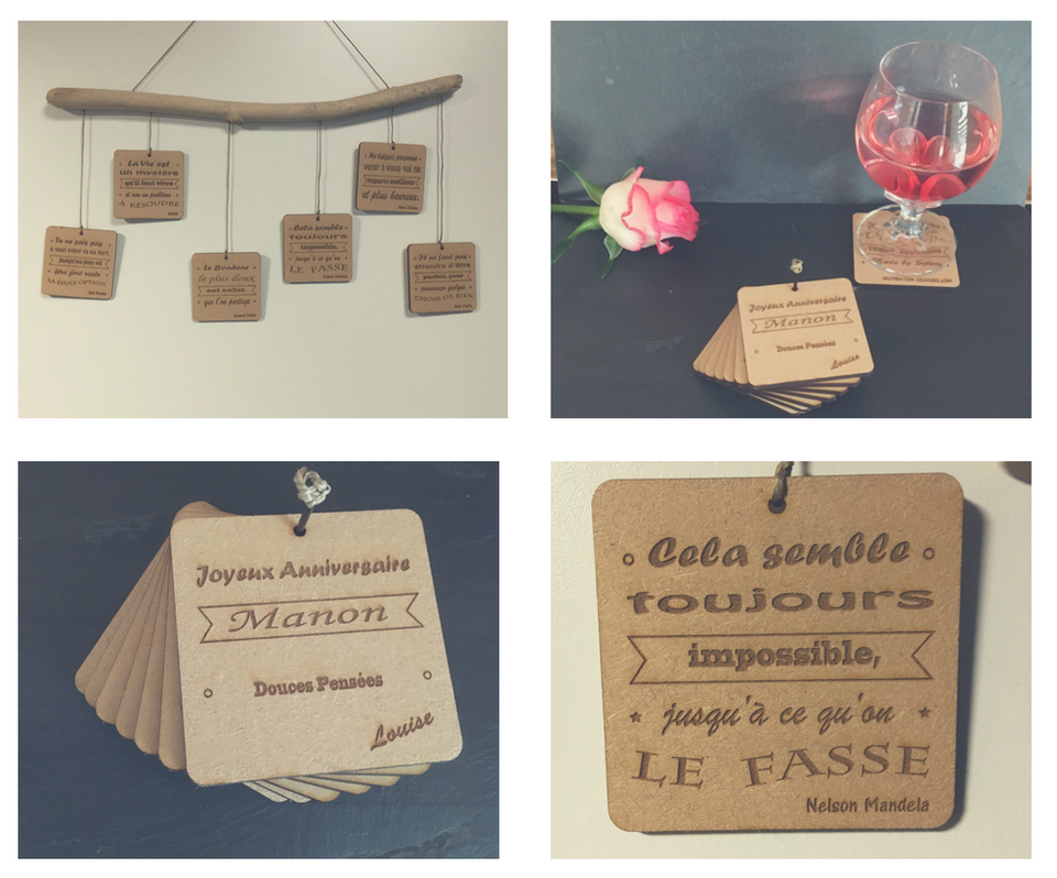 Tableaux en Bois MDF (3mm) – format 6,5 x 6,5 cm – gravés – percés : 24 € les 6
