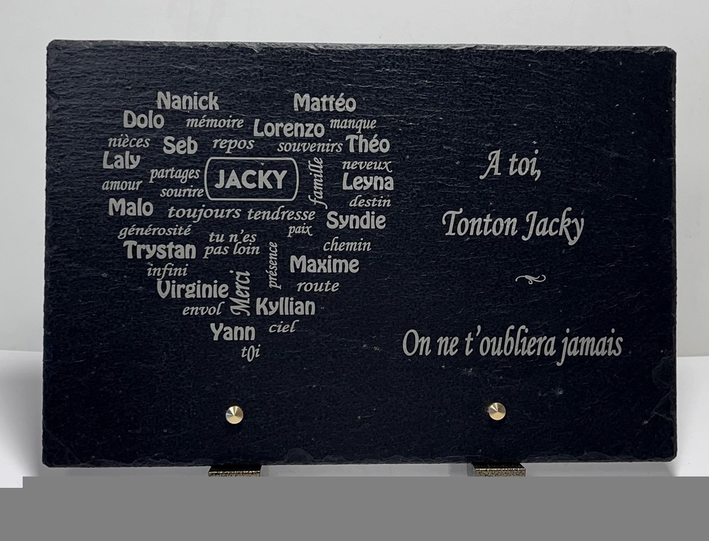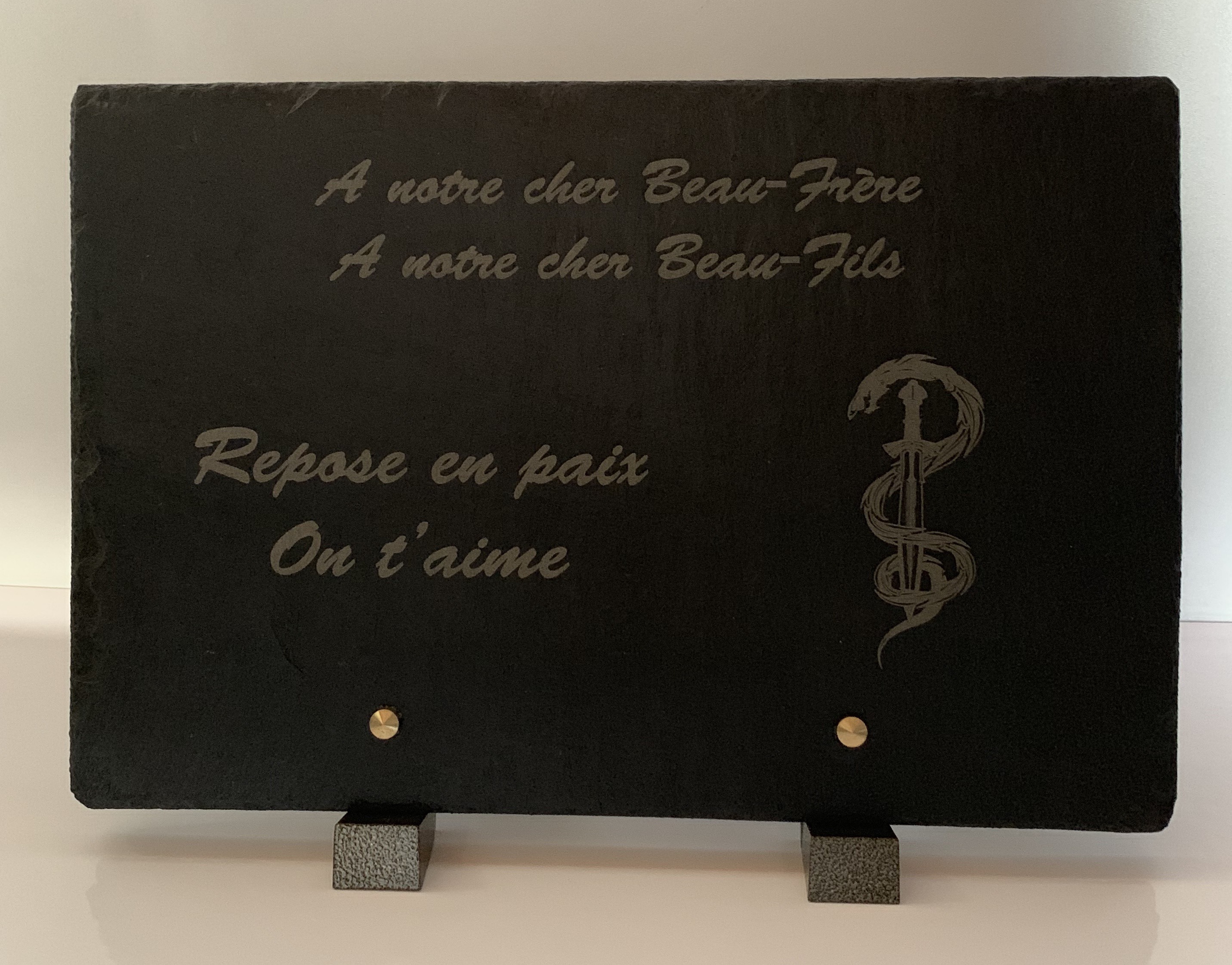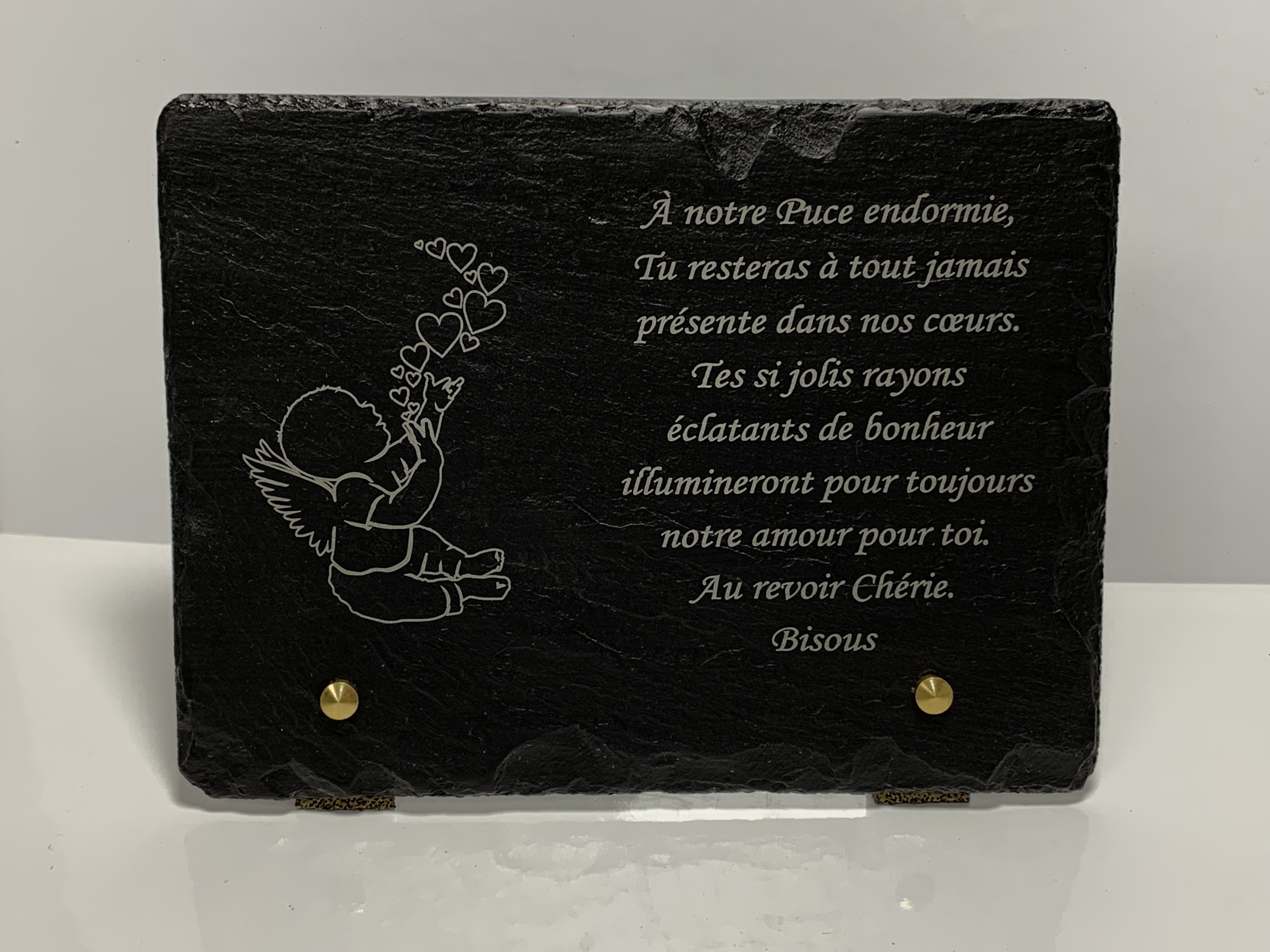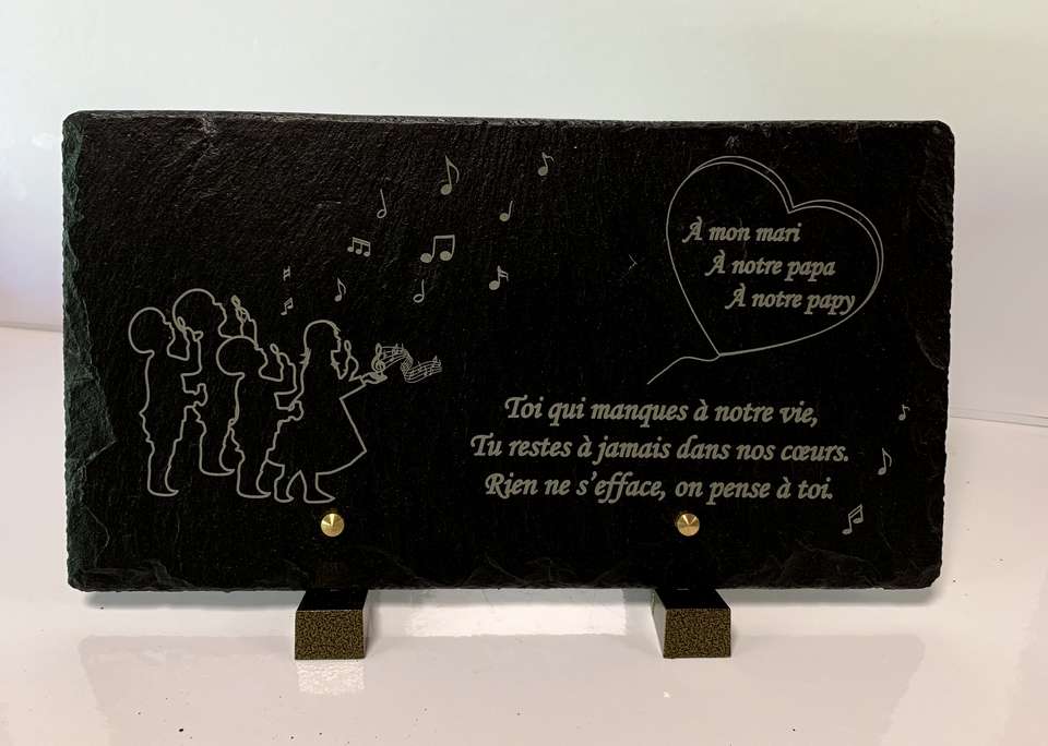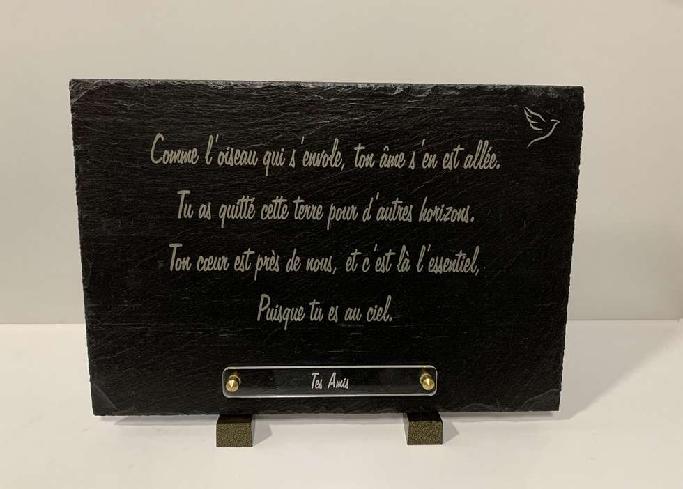 Ardoises naturelles découpées à la main (permet l’aspect biseauté des côtés), d’un format maximum de 22 x 32 cm pouvant être découpées selon votre souhait. Le tarif moyen d’une ardoise gravée sur pieds funéraires est d’environ 80 à 150 € (port en sus env 18€). Dans un 1er temps, 2 ou 3 simulations vous sont envoyées pour affiner vos préférences ; un échange mails permet d’arriver jusqu’à correspondance totale avec la personnalisation souhaitée. Après validation de votre part, un devis vous est adressé. Dès réception du règlement, je procède à la gravure et à l’expédition (par colissimo ou Mondial relay).