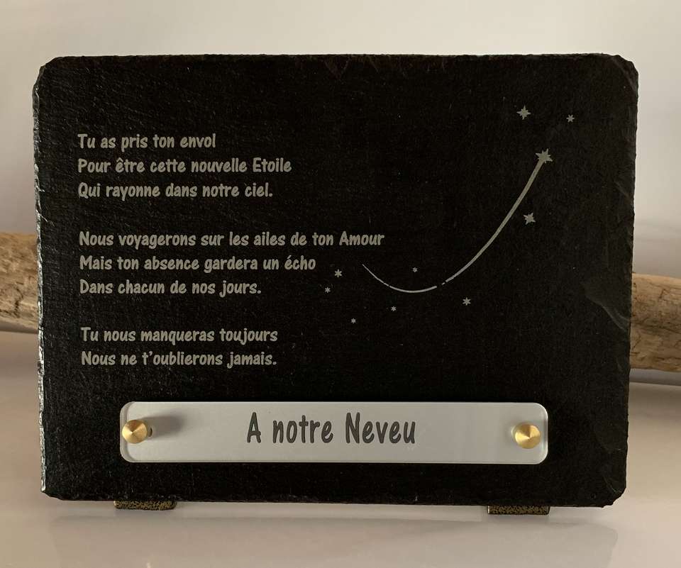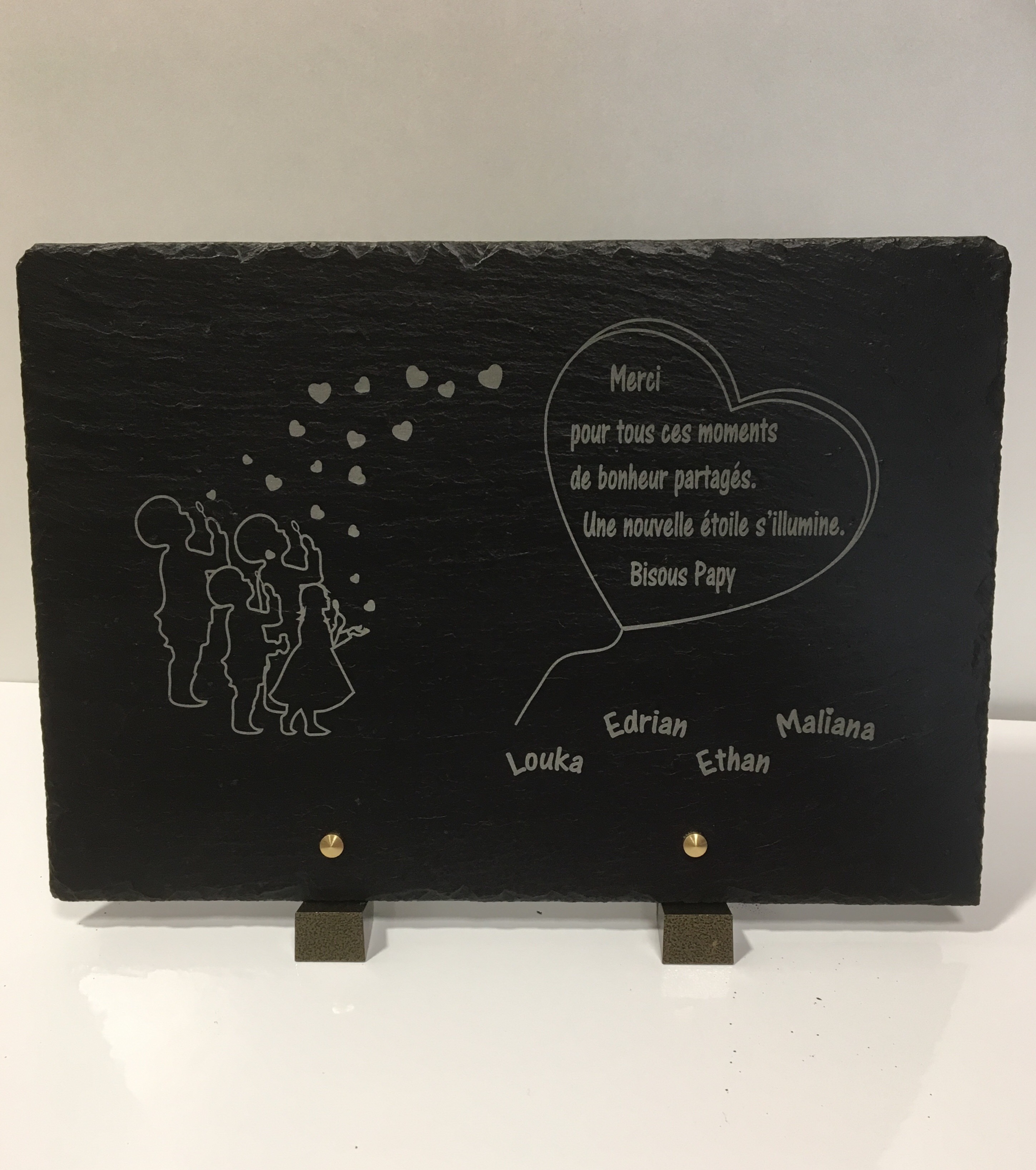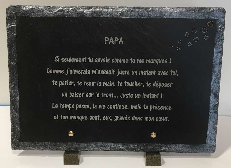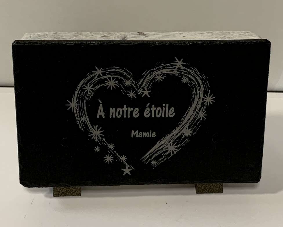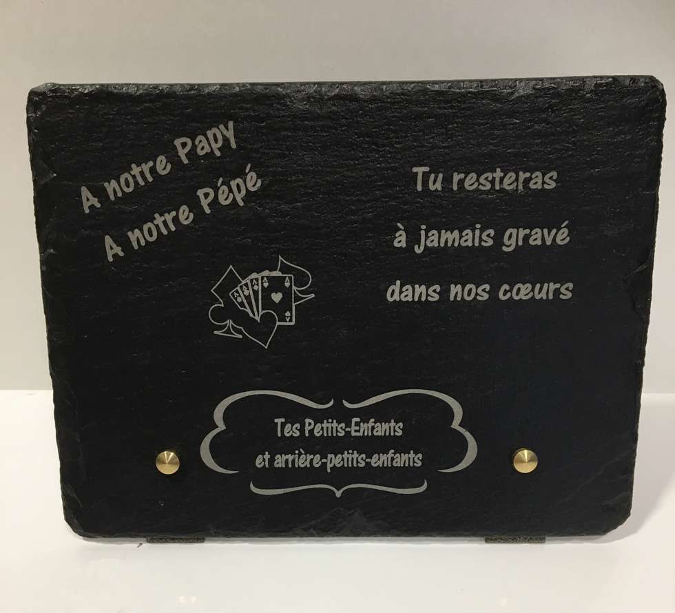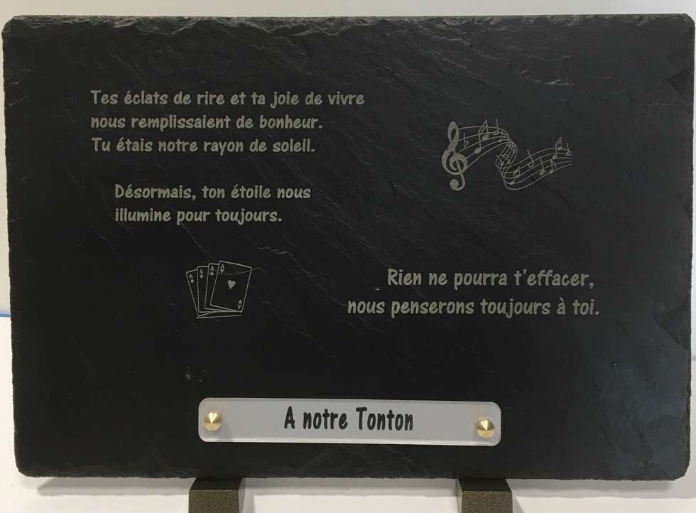 Ardoises naturelles découpées à la main (permet l’aspect biseauté des côtés), d’un format maximum de 22 x 32 cm pouvant être découpées selon votre souhait. Le tarif moyen d’une ardoise gravée sur pieds funéraires est d’environ 80 à 150 € (port en sus env 18€). Dans un 1er temps, 2 ou 3 simulations vous sont envoyées pour affiner vos préférences ; un échange mails permet d’arriver jusqu’à correspondance totale avec la personnalisation souhaitée. Après validation de votre part, un devis vous est adressé. Dès réception du règlement, je procède à la gravure et à l’expédition (par colissimo ou Mondial relay).
