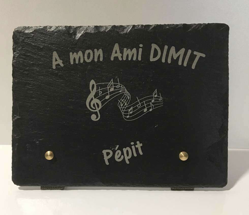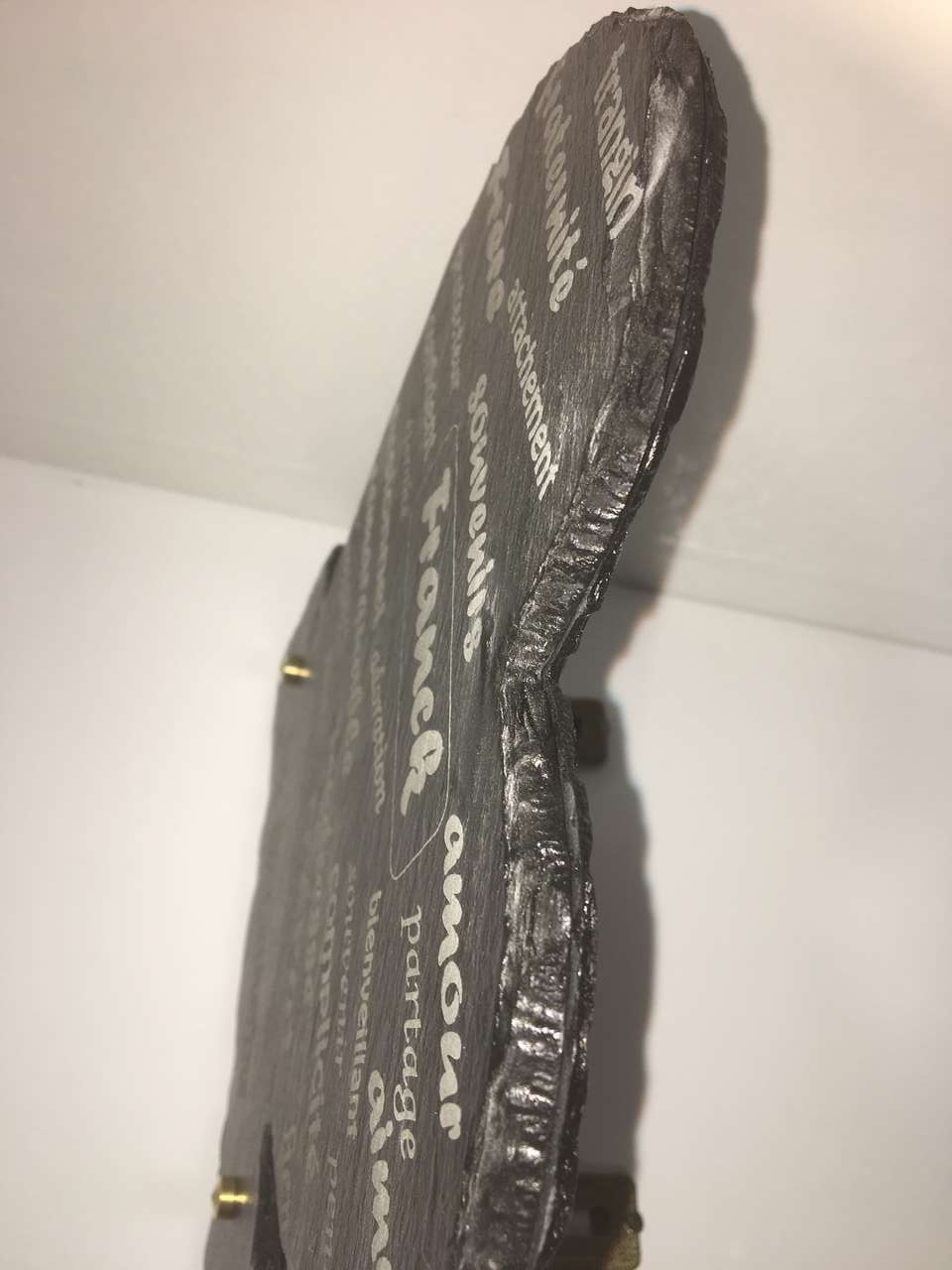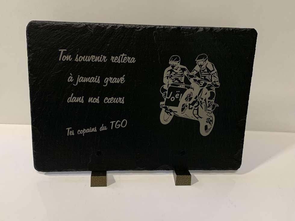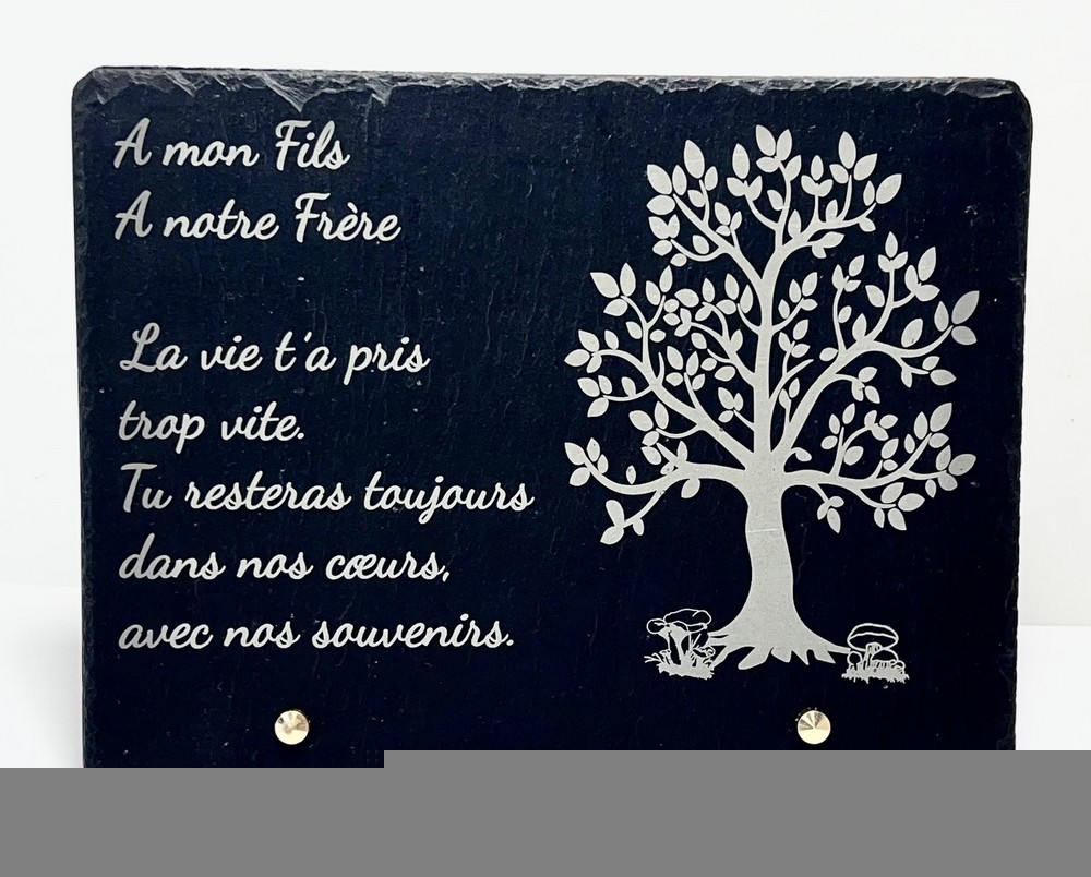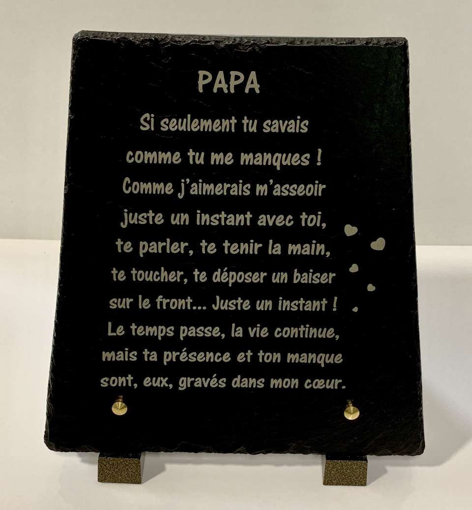 Ardoises naturelles découpées à la main (permet l’aspect biseauté des côtés), d’un format maximum de 22 x 32 cm pouvant être découpées selon votre souhait. Le tarif moyen d’une ardoise gravée sur pieds funéraires est d’environ 80 à 150 € (port en sus env 18€). Dans un 1er temps, 2 ou 3 simulations vous sont envoyées pour affiner vos préférences ; un échange mails permet d’arriver jusqu’à correspondance totale avec la personnalisation souhaitée. Après validation de votre part, un devis vous est adressé. Dès réception du règlement, je procède à la gravure et à l’expédition (par colissimo ou Mondial relay).